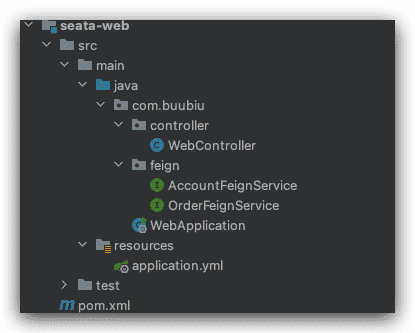 seata-web 子项目,主要处理客户端下单请求,feign远程调用order,和account服务接口,最终完成