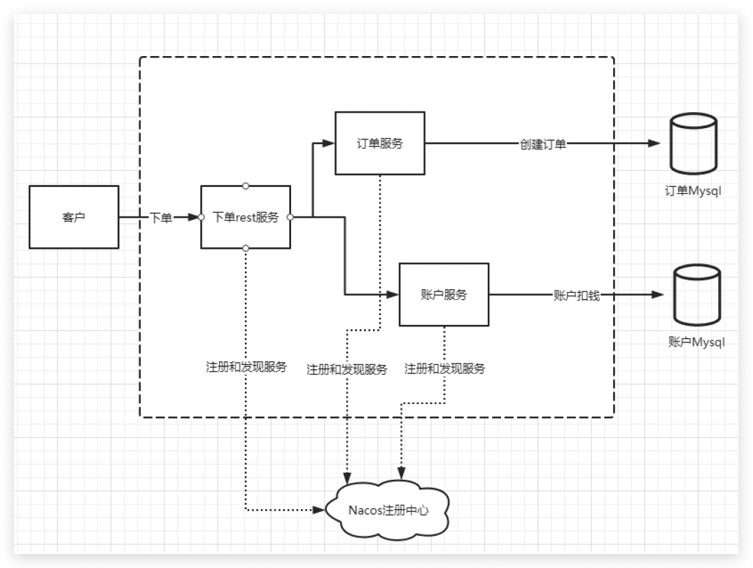 我们模拟一个简单下单业务,客户端调用rest对外服务,rest服务再调用订单服务实现创建订单和账户服