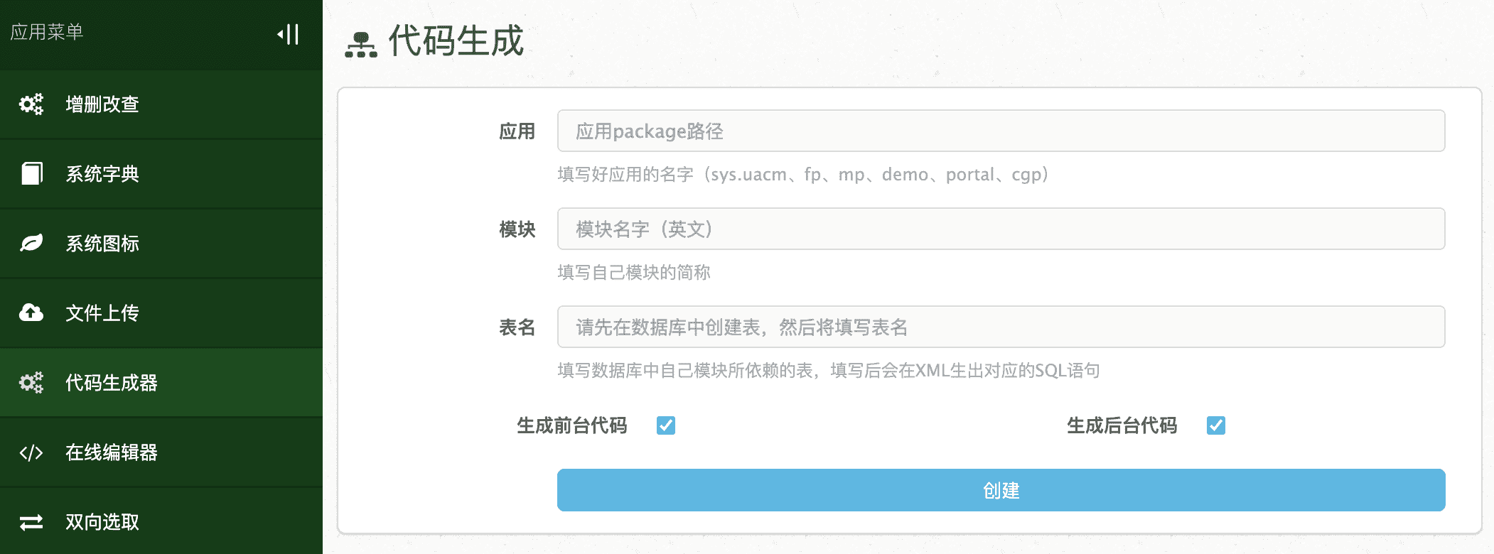 通过代码生成器可以快速的生成简单的代码样例,根据自己的业务逻辑需求在此基础上进行修改即可。点击 【创建】 按钮之前需要填写部分内容,填写说明如下: