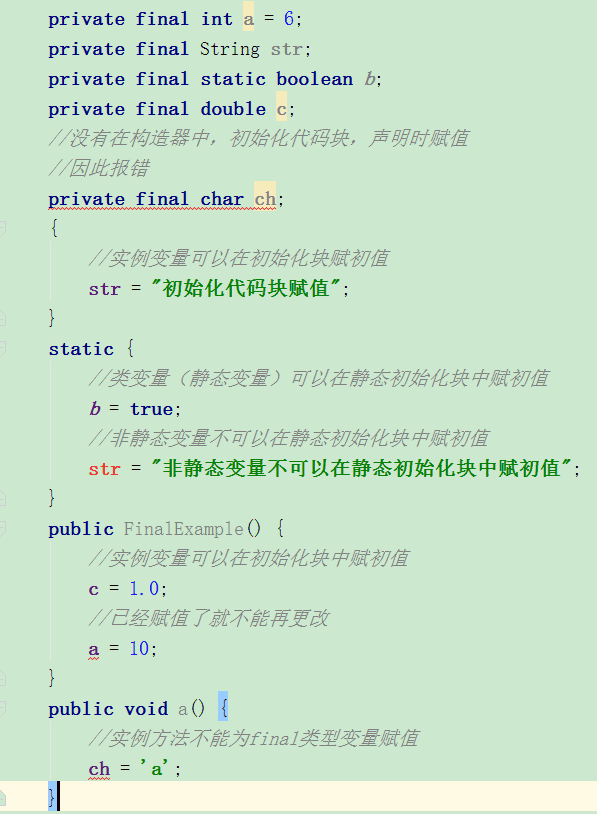 - 实例变量:必要要在非静态初始化块,声明该实例变量或者在构造器中指定初始值,而且只能在这三个地方进行指定。