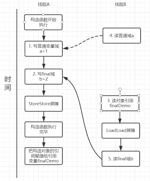 因此,写final域的重排序规则可以确保:在对象引用为任意线程可见之前,对象的final域已经被正确初始化过了,而普通域就不具有这个保障。比如在上例,线程B有可能就是一个未正确初始化的对象finalDemo。