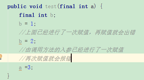 final局部变量由程序员进行显式初始化,如果final局部变量已经进行了初始化则后面就不能再次进行更改,如果final变量未进行初始化,可以进行赋值,当且仅有一次赋值,一旦赋值之后再次赋值就会出错。下面用具体的代码演示final局部变量的情况: