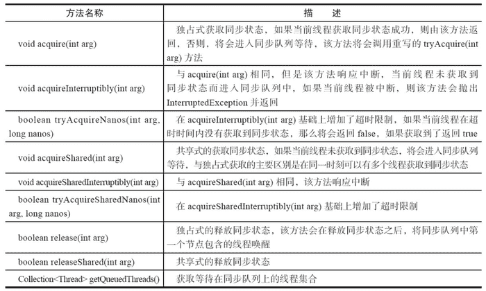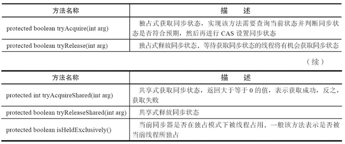 AQS可重写的方法如下图(摘自《Java并发编程的艺术》一书):