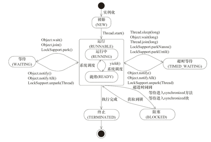 此图来源于《JAVA并发编程的艺术》一书中,线程是会在不同的状态间进行转换的,java线程线程转换图如上图所示。线程创建之后它将处于 NEW(新建) 状态,之后调用start()方法开始运行,当调用wait(),join(),LockSupport.lock()方法线程会进入到WAITING(等待)状态,而同样的wait(long timeout),sleep(long),join(long),LockSupport.parkNanos(),LockSupport.parkUtil()增加了超时等待的功能,也就是调用这些方法后线程会进入TIMED_WAITING(超时等待)状态,当超时等待时间到达后,线程会切换到Runable的状态,另外当WAITING和TIMED _WAITING状态时可以通过Object.notify(),Object.notifyAll()方法使线程转换到Runable状态。当线程出现资源竞争时,即等待获取锁的时候,线程会进入到BLOCKED阻塞状态,当线程获取锁时,线程进入到Runable状态。线程运行结束后,线程进入到TERMINATED状态,状态转换可以说是线程的生命周期。另外需要注意的是: