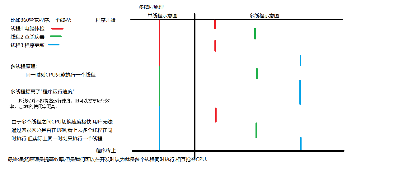 多线程并不能提高运行速度,但可以提高运行效率,让CPU的使用率更高。但是如果多线程有安全问题或出现频繁的上下文切换时,运算速度可能反而更低。
