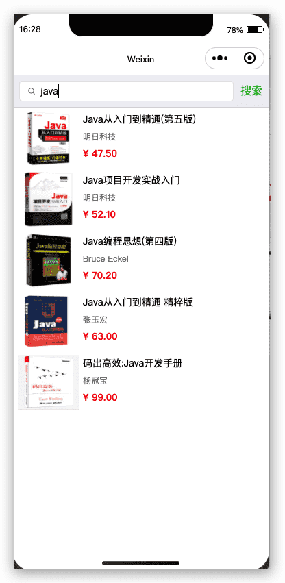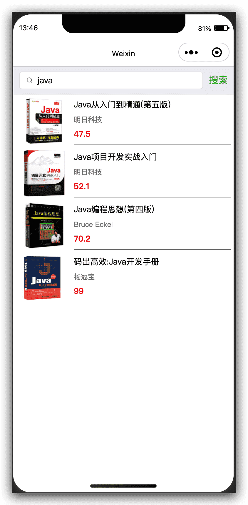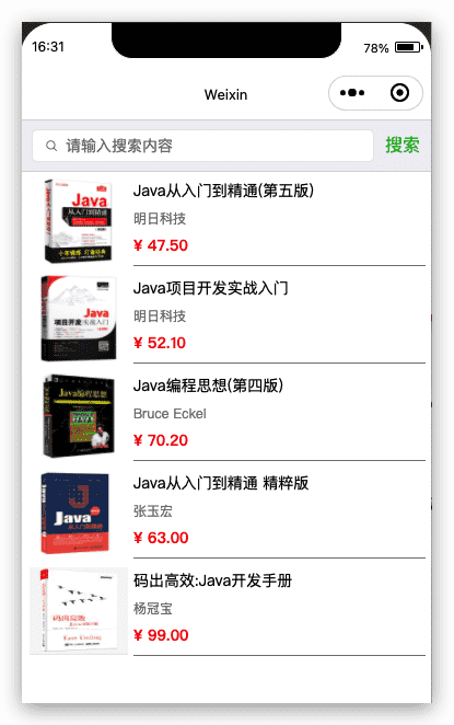 模拟实现一个微信小程序端关键字图书,然后显示图书列表的功能,如下图: