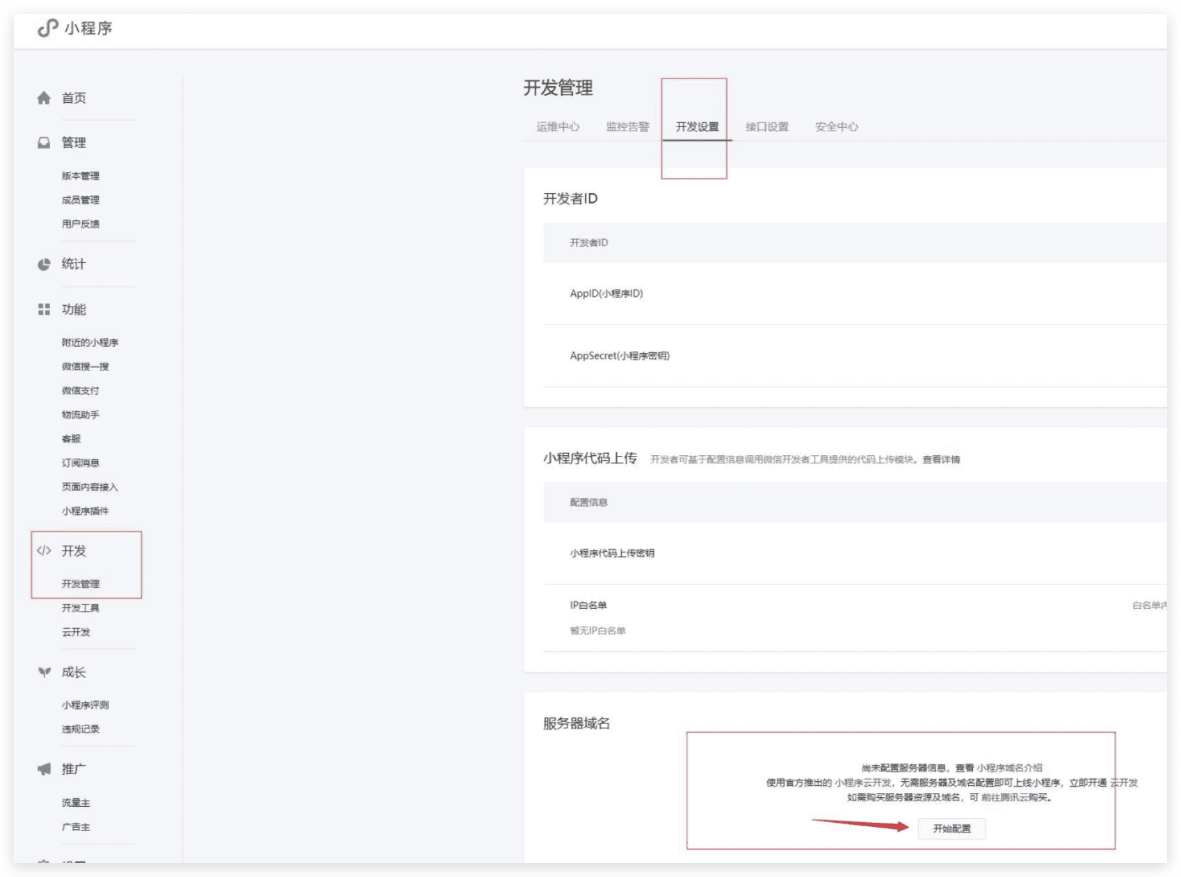 服务器域名请在 「小程序后台-开发-开发设置-服务器域名」 中进行配置,配置时需要注意:
