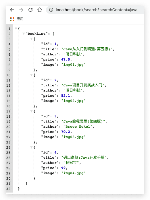 启动项目,浏览器地址栏输入:http://localhost/book/search?searchContent=java 页面显示: