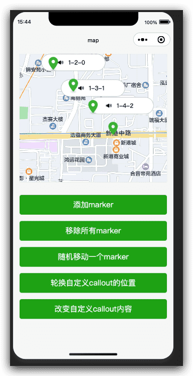 使用方式如下,map 组件下添加名为 callout 的 slot 节点,其内部的 cover-view 通过 marker-id 属性与 marker 绑定。当 marker 创建时,该 cover-view 显示的内容将作为 callout 显示在标记点上方。