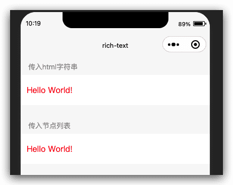 tip: nodes 不推荐使用 String 类型,性能会有所下降。tip:rich-text组件内屏蔽所有节点的事件。tip: attrs 属性不支持 id ,支持 class 。tip: name 属性大小写不敏感。tip: 如果使用了不受信任的HTML节点,该节点及其所有子节点将会被移除。tip: img 标签仅支持网络图片。tip: 如果在自定义组件中使用rich-text组件,那么仅自定义组件的 wxss 样式对rich-text中的 class 生效。