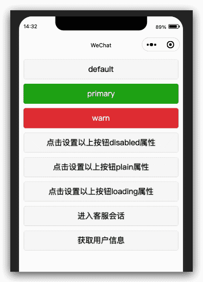 tip:button-hover默认为{background-color: rgba(0, 0, 0, 0.1); opacity: 0.7;}tip:bindgetphonenumber从1.2.0 开始支持,但是在1.5.3以下版本中无法使用wx.canIUse进行检测,建议使用基础库版本进行判断。tip: 在bindgetphonenumber等返回加密信息的回调中调用 wx.login 登录,可能会刷新登录态。此时服务器使用 code 换取的 sessionKey 不是加密时使用的 sessionKey,导致解密失败。建议开发者提前进行login;或者在回调中先使用checkSession进行登录态检查,避免login刷新登录态。tip: 从 2.1.0 起,button 可作为原生组件的子节点嵌入,以便在原生组件上使用open-type的能力。tip: 目前设置了form-type的button只会对当前组件中的form有效。因而,将button封装在自定义组件中,而form在自定义组件外,将会使这个button的form-type失效。