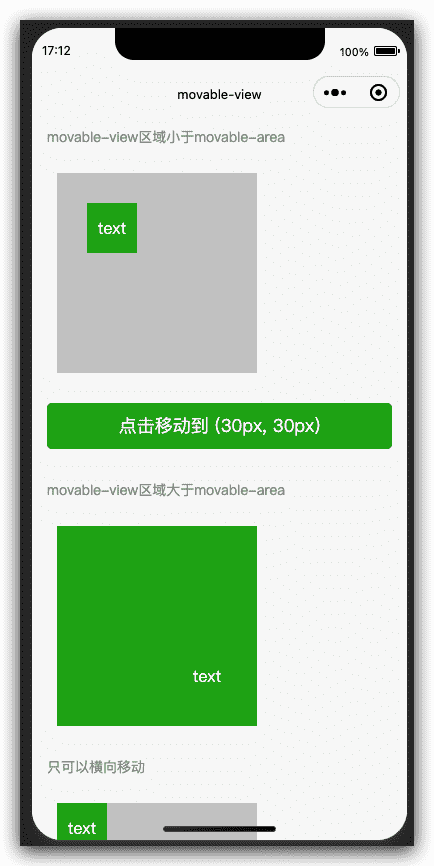 可移动的视图容器,在页面中可以拖拽滑动。movable-view必须在 movable-area 组件中,并且必须是直接子节点,否则不能移动。
