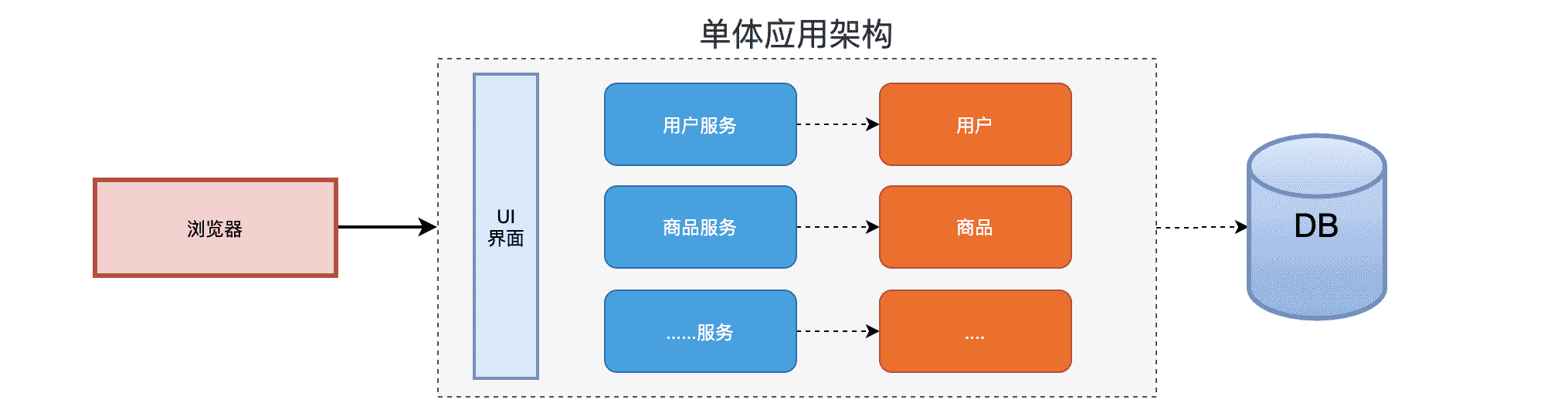 起初当网站流量很小时,将所有功能都写在一个应用里面,对整个应用进行部署,以减少部署节点和成本。对于这个架构简化增删改查的工作量的数据访问框架(ORM)是关键。