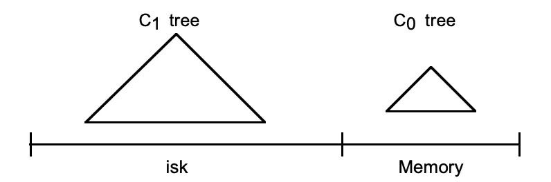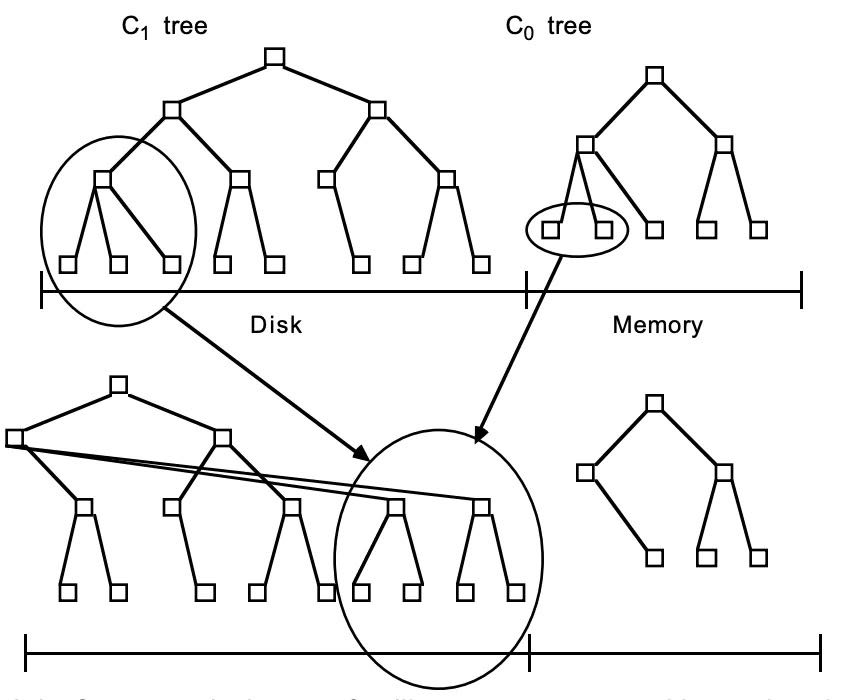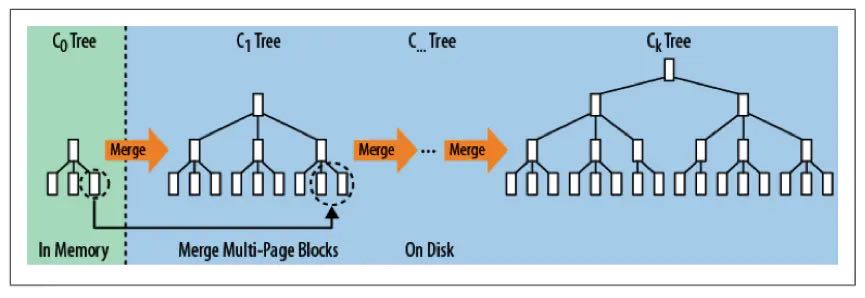 在LSM树中,最低一级也是最小的C0树位于内存里,而更高级的C1、C2…树都位于磁盘里。数据会先写入内存中的C0树,当它的大小达到一定阈值之后,C0树中的全部或部分数据就会刷入磁盘中的C1树,如下图所示。