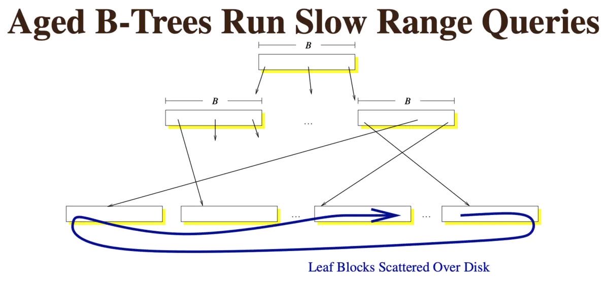 - 如果B+树已经运行了很长时间,写入了很多数据,随着叶子节点分裂,其对应的块会不再顺序存储,而变得分散。这时执行范围查询也会变成随机读,效率降低了。