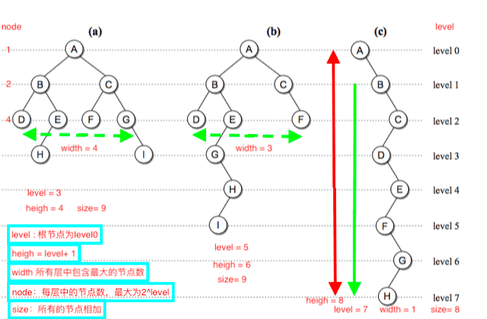 节点深度(depth), 树的高度(height), 树的宽度(width), 树的 size