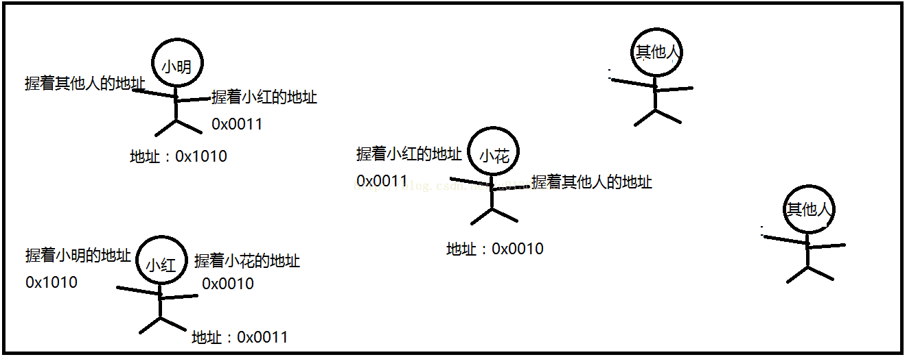 就是小明握有小红的地址,小红握有小花的地址,而小花又握有小明的地址,这样就形成了一个循环