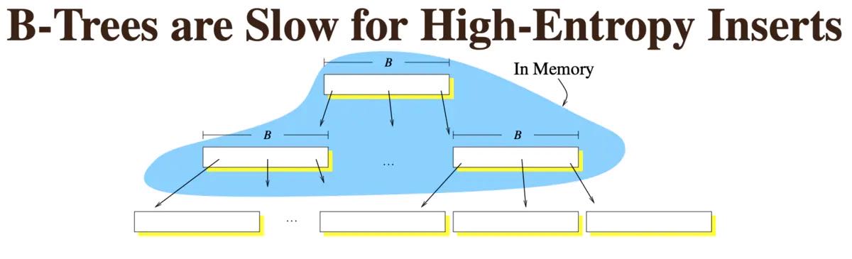 - 如果写入的数据比较离散,那么寻找写入位置时,子节点有很大可能性不会在内存中,最终会产生大量的随机写,性能下降。下图来自[TokuDB的PPT],说明了这一点。
