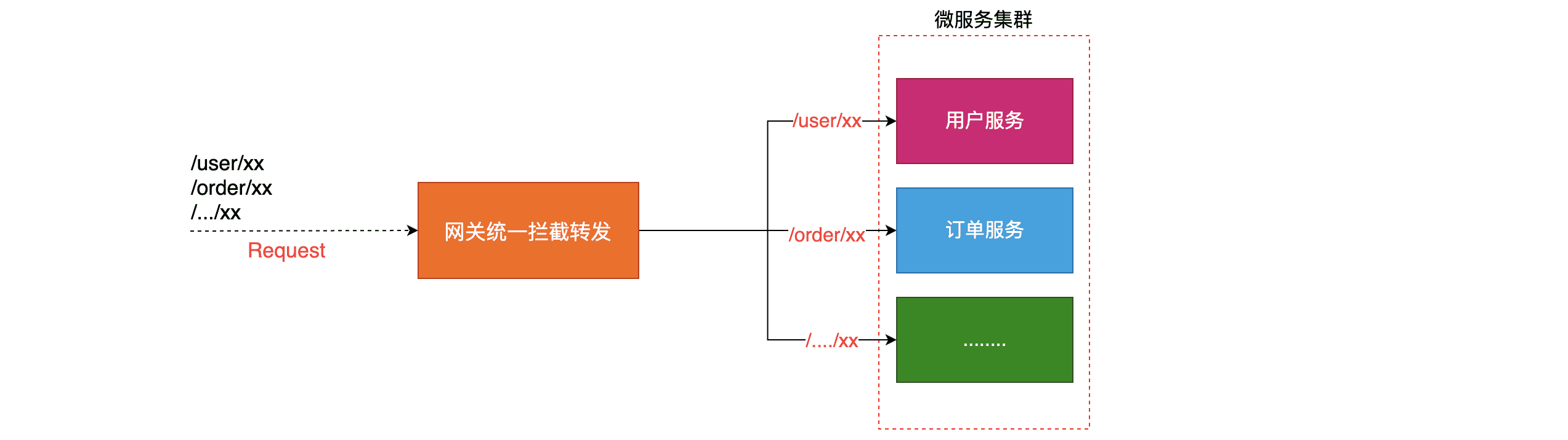 路由转发:接收一切外界请求,转发到后端的微服务上去;