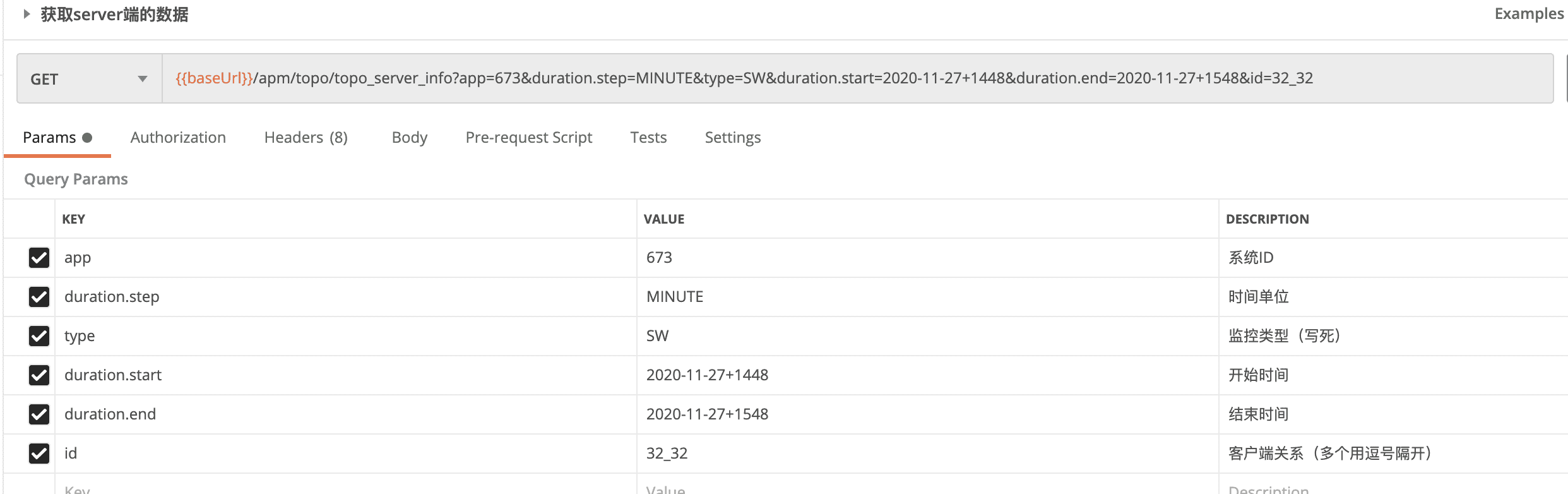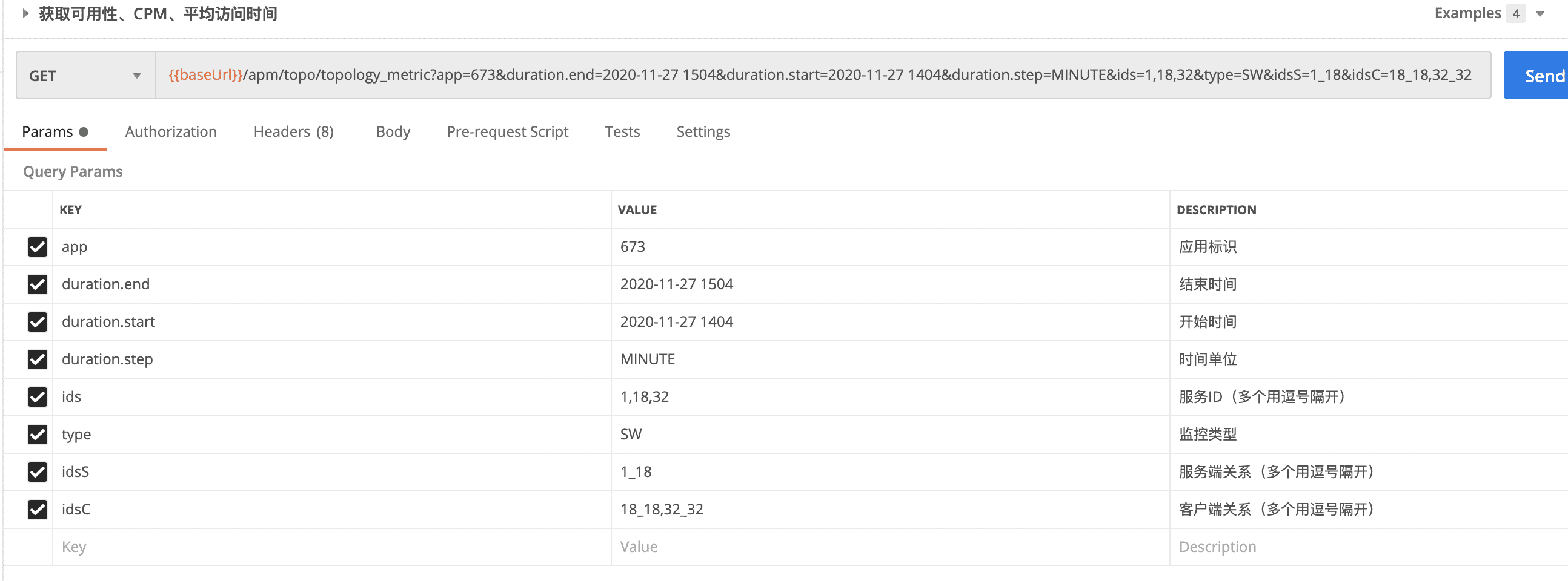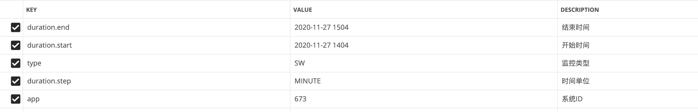 | "data": { "getGlobalTopologyByLabel": { "nodes": [{ --拓扑图的服务节点集合 "id": "32",--服务节点ID "name": "sc-nacos-demo-8789",--节点服务名称 "type": "SpringMVC",--节点服务类型 "isReal": "true",--是否是真实的 "nodeType": 0 }, { "id": "1", "name": "User", "type": "USER", "isReal": "false", "nodeType": 0 }, { "id": "18", "name": "bufx-sc-nacos-demo-8789", "type": "SpringMVC", "isReal": "true", "nodeType": 0 } ], "calls": [{ --拓扑图的链路结合 "id": "18_18",--链路ID "source": "18",--链路起始节点ID "target": "18",--链路结束阶段ID "callType": "SpringRestTemplate",--链路类型 "detectPoint": null, "detectPoints": [--链路侦查端类型 "CLIENT", "SERVER" ] }, { "id": "32_32", "source": "32", "target": "32", "callType": "SpringRestTemplate", "detectPoint": null, "detectPoints": [ "CLIENT", "SERVER" ] }, { "id": "1_18", "source": "1", "target": "18", "callType": "", "detectPoint": null, "detectPoints": [ "SERVER" ] } ] } } }