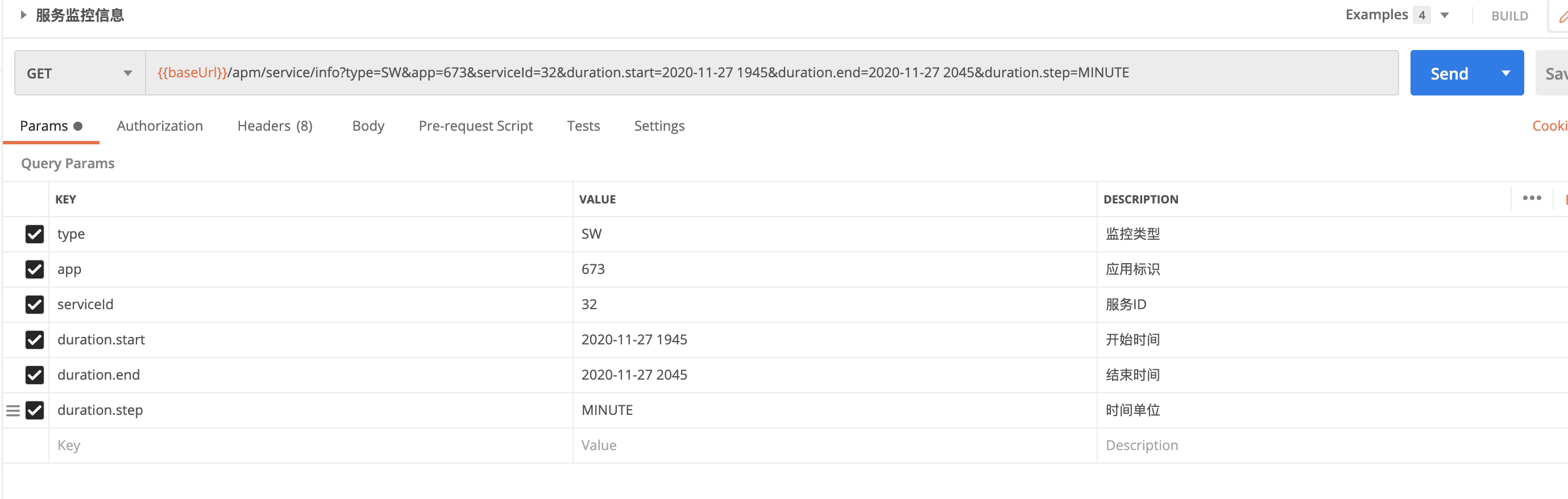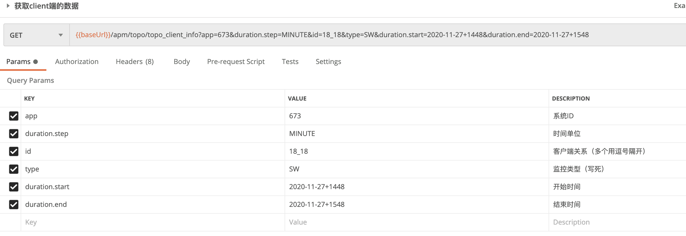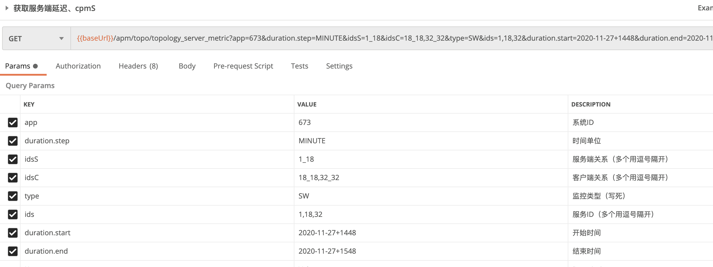 | "data": { "getGlobalTopologyByLabel": { "nodes": [{ --拓扑图的服务节点集合 "id": "32",--服务节点ID "name": "sc-nacos-demo-8789",--节点服务名称 "type": "SpringMVC",--节点服务类型 "isReal": "true",--是否是真实的 "nodeType": 0 }, { "id": "1", "name": "User", "type": "USER", "isReal": "false", "nodeType": 0 }, { "id": "18", "name": "bufx-sc-nacos-demo-8789", "type": "SpringMVC", "isReal": "true", "nodeType": 0 } ], "calls": [{ --拓扑图的链路结合 "id": "18_18",--链路ID "source": "18",--链路起始节点ID "target": "18",--链路结束阶段ID "callType": "SpringRestTemplate",--链路类型 "detectPoint": null, "detectPoints": [--链路侦查端类型 "CLIENT", "SERVER" ] }, { "id": "32_32", "source": "32", "target": "32", "callType": "SpringRestTemplate", "detectPoint": null, "detectPoints": [ "CLIENT", "SERVER" ] }, { "id": "1_18", "source": "1", "target": "18", "callType": "", "detectPoint": null, "detectPoints": [ "SERVER" ] } ] } } }