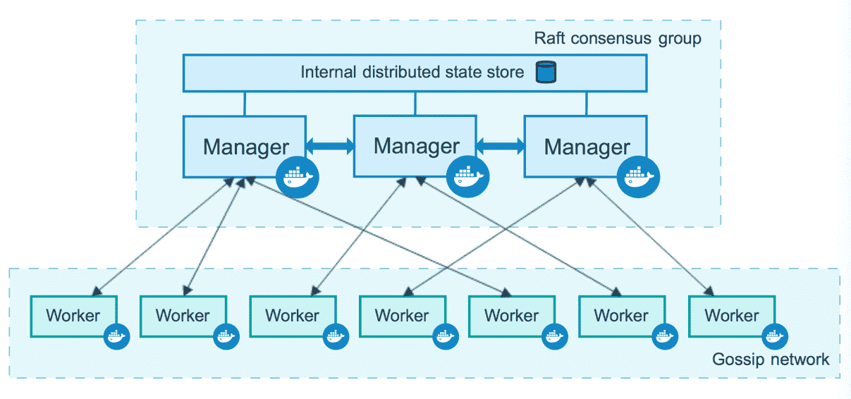 管理节点用于 Swarm 集群的管理,docker swarm 命令基本只能在管理节点执行(节点退出集群命令 docker swarm leave 可以在工作节点执行)。一个 Swarm 集群可以有多个管理节点,但只有一个管理节点可以成为 leader,leader 通过 raft 协议实现。