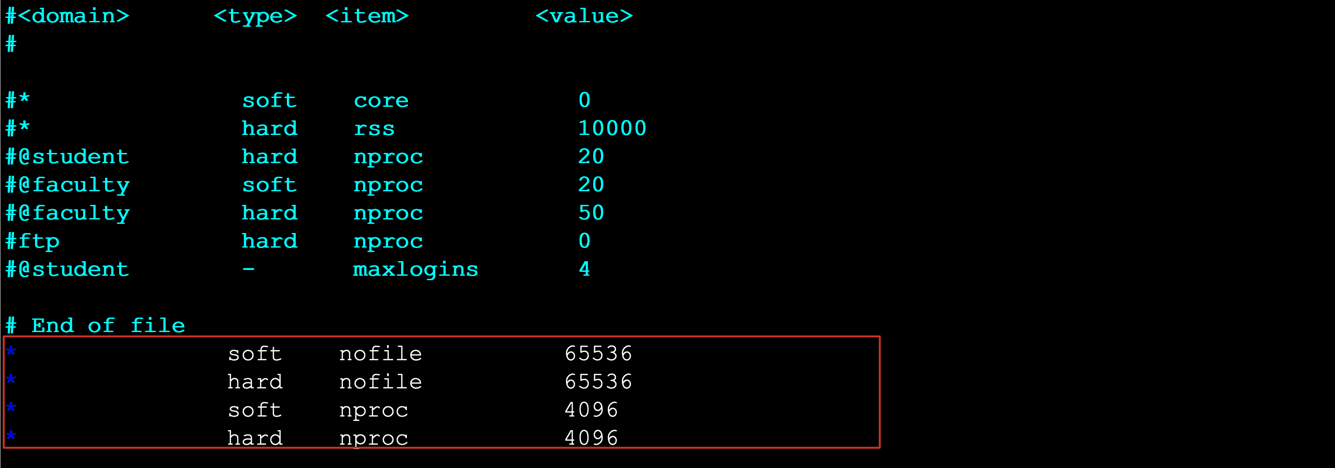 1 | vim /etc/security/limits.conf 在最后面追加下面内容 |
