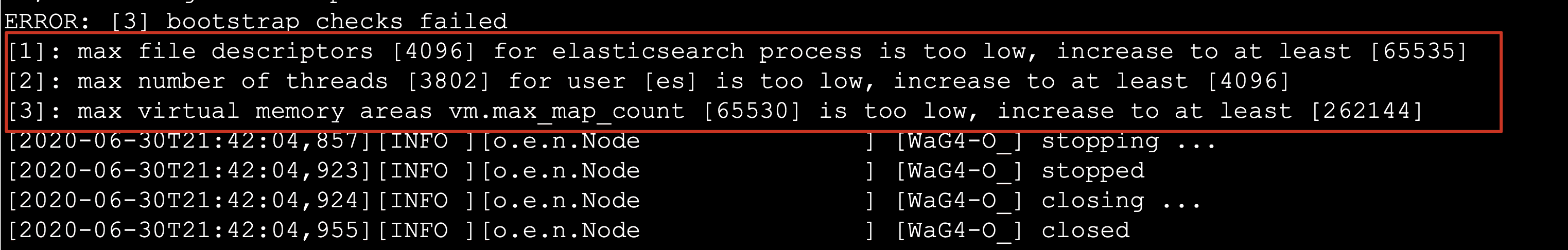 1 | ERROR: [3] bootstrap checks failed |