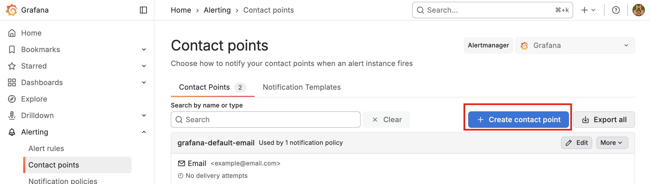 Grafana 内置了告警服务,使用联系点来指定接收警报通知的媒介。联系点包含发送警报通知的配置,包括电子邮件、Slack、IRM、Webhook 等媒介。