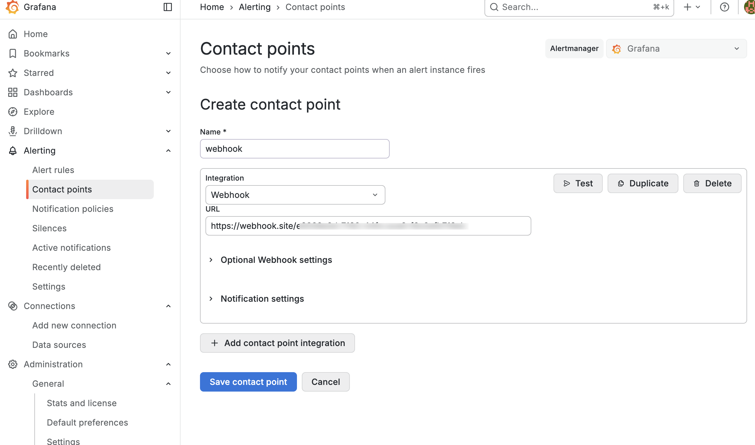 下面以 webhook (Webhook.site)为例,来创建一个联系点。