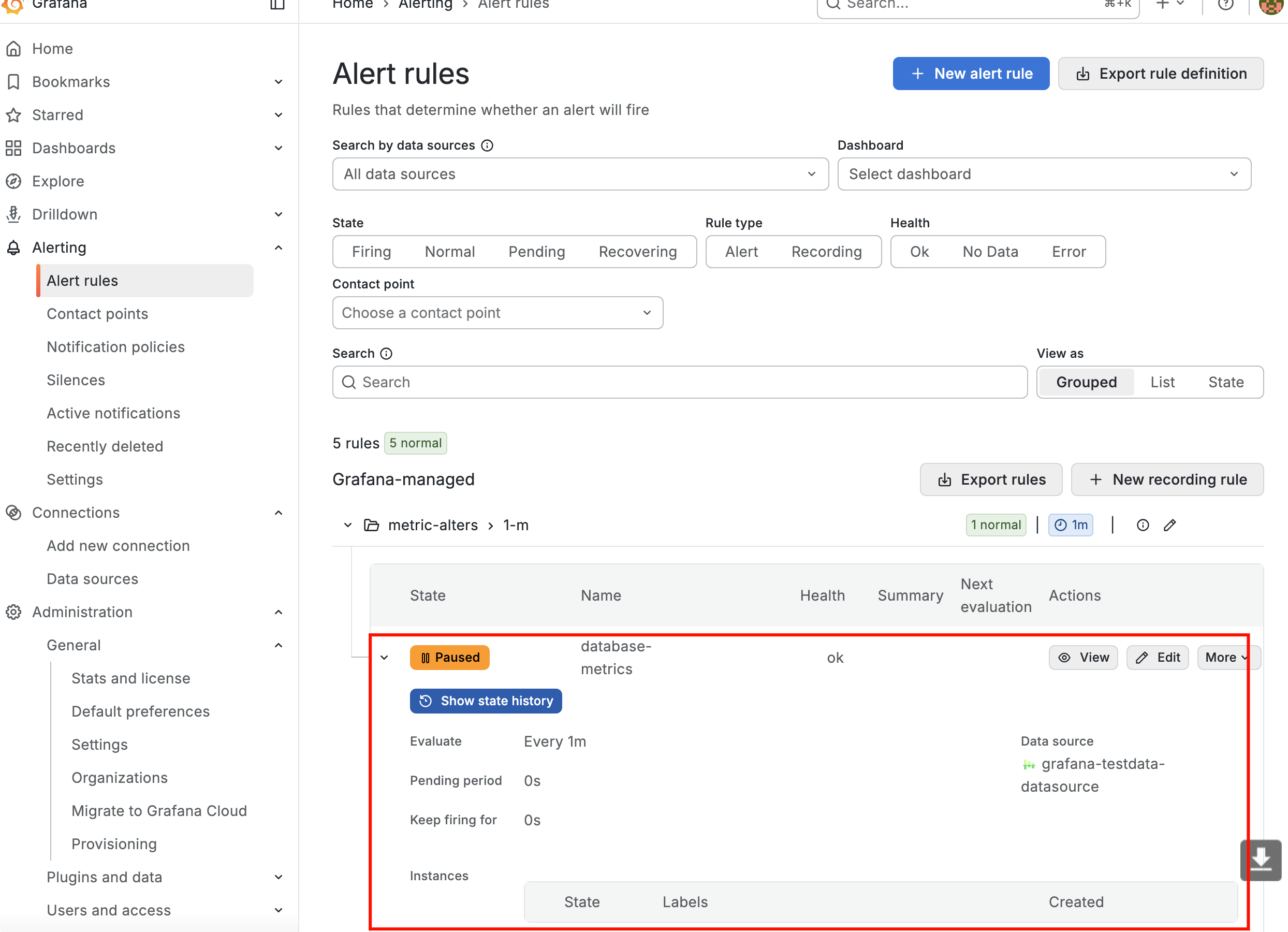输入名称,选择自带的测试数据源,设置告警文件夹与告警评估行为,配置刚刚创建的联系点,点击保存。
