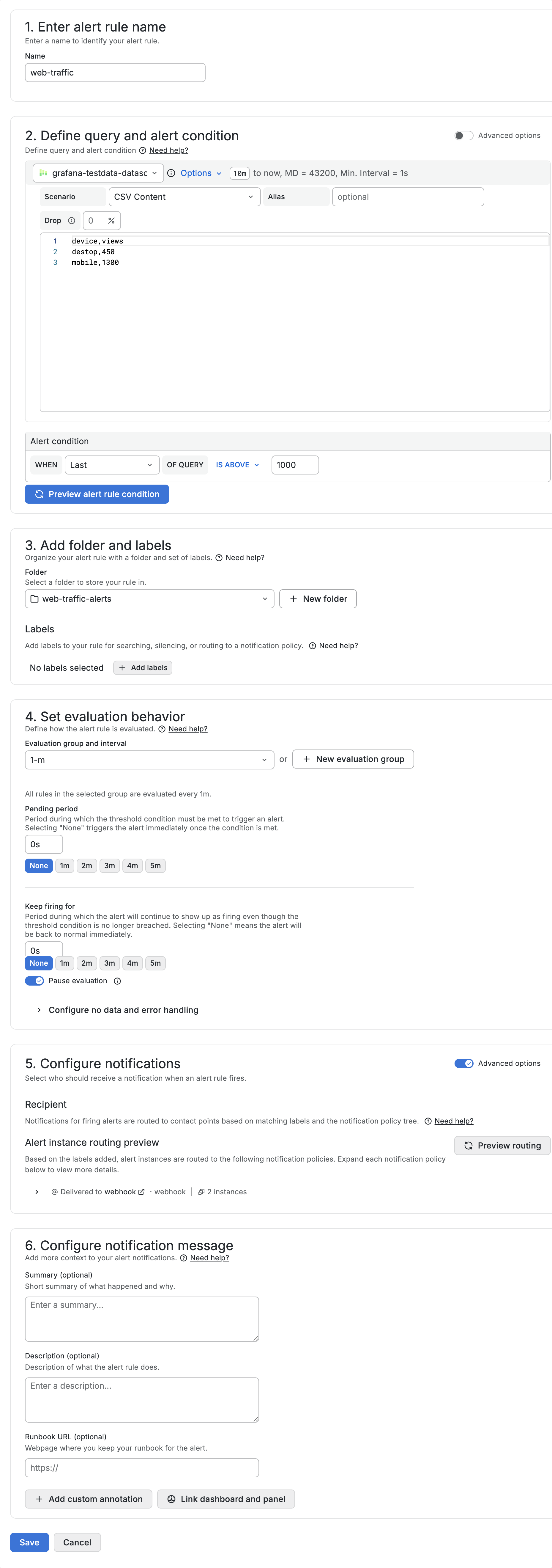 假设正在使用Grafana监控网站流量,并设置了一个告警规则: