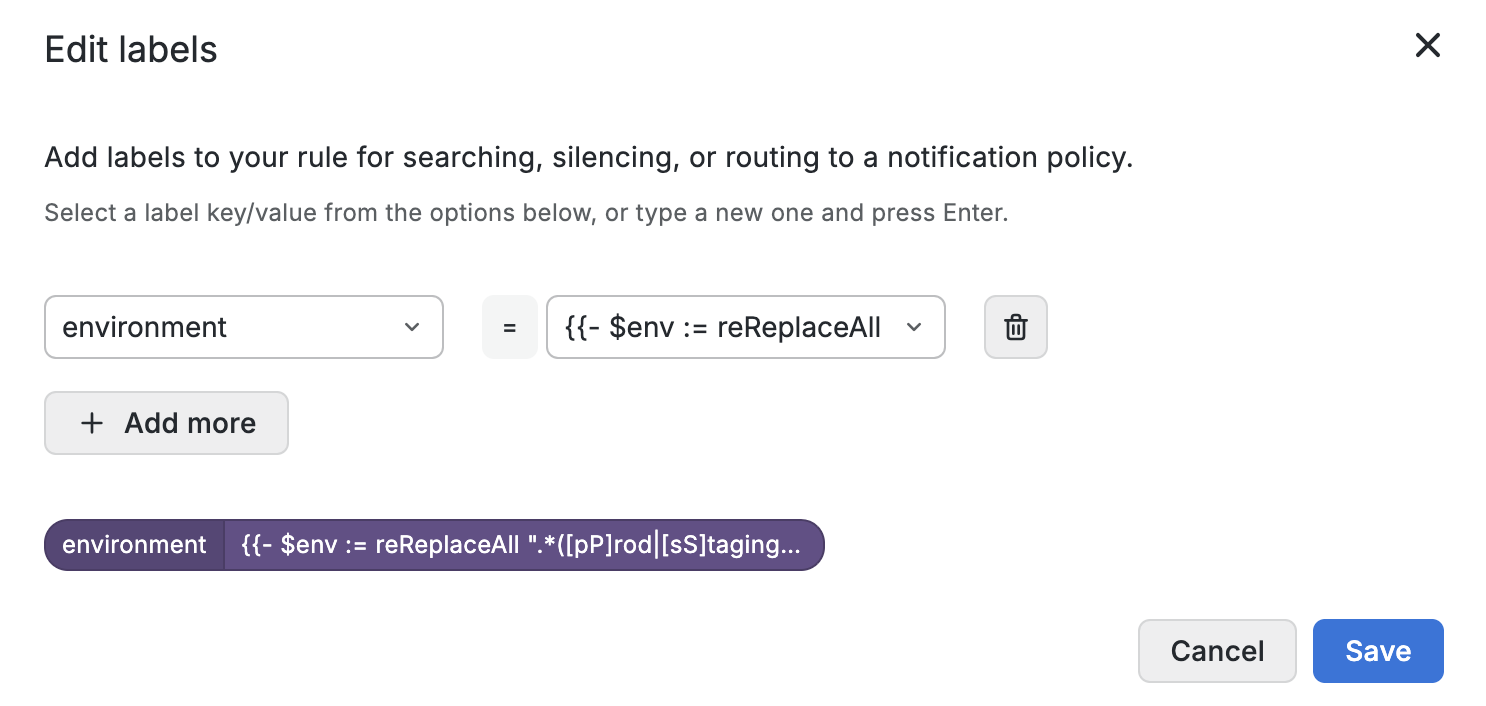 1 | {{- $env := reReplaceAll ".*([pP]rod|[sS]taging|[dD]ev).*" "${1}" $labels.instance -}} |