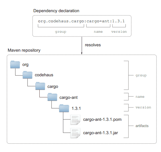 下面以Maven仓库来介绍,Maven仓库是Java项目中使用最为广泛的一个仓库,库文件一般是以JAR文件的形式存在,用XML(POM文件)来描述库的元数据和它的传递依赖。所有的库文件都存储在仓库的指定位置,当你在构建脚本中声明了依赖时,这些属性用来找到库文件在仓库中的准确位置。group属性标识了Maven仓库中的一个子目录,下图展示了Cargo依赖属性是怎么对应到仓库中的文件的: