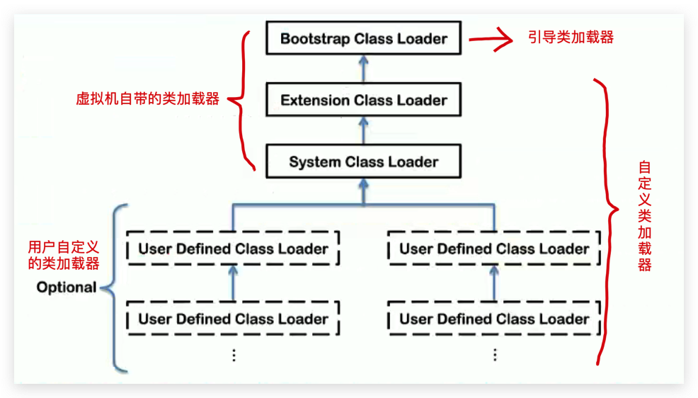 JVM支持两种类型的类加载器,分别为引导类加载器(Bootstrap ClassLoader)和自定义类加载器(UserDefined ClassLoader)-将所有派生与抽象类ClassLoader的类加载器都划分为自定义类加载器。