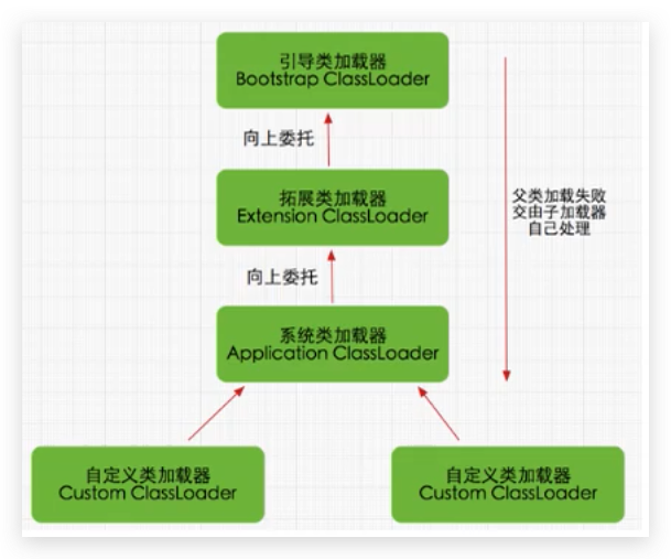 - 如果一个类加载器收到了类加载请求,它并不会自己先去加载,而是把这个请求委托给父类的加载器区执行;