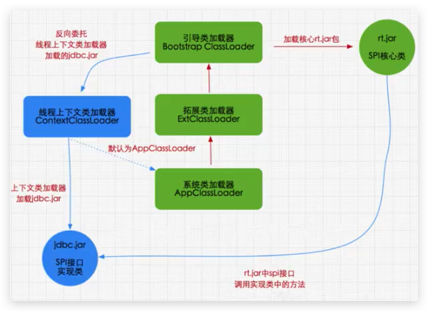 - 这时候就会反向委托线程上下文类加载器加载jdbc.jar,而线程上下文类加载器就是系统类加载器