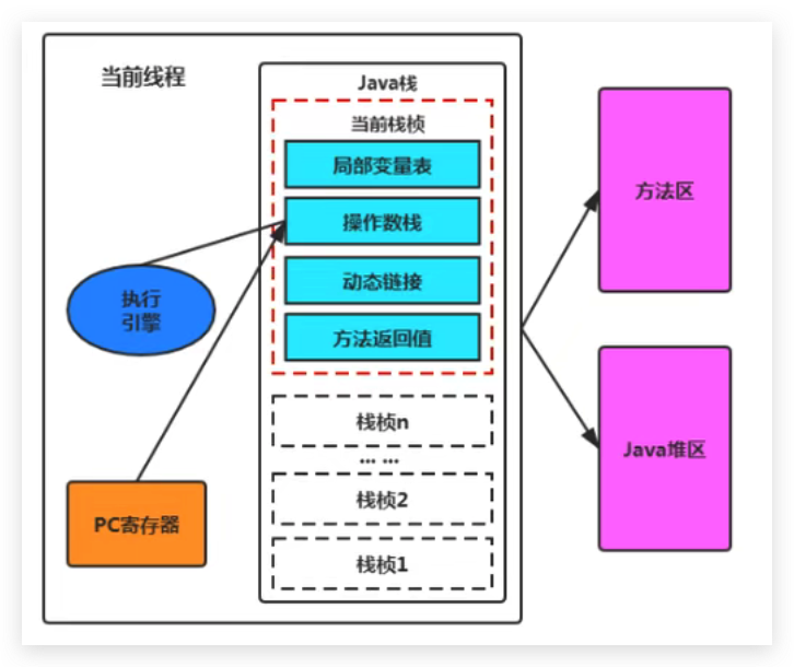 任何时间一个线程都只有一个方法在执行,也就是所谓的当前方法。程序计数器会存储当前线程正在执行的Java方法的JVM指令地址;或者,如果是在执行native(本地方法栈,调用c/c++的时候)方法,则地址是未指定值(undefined)。
