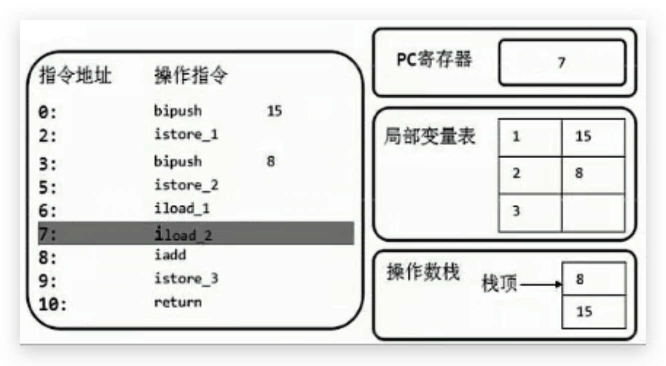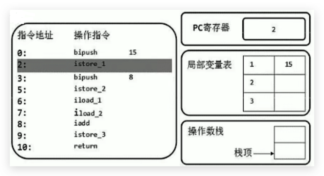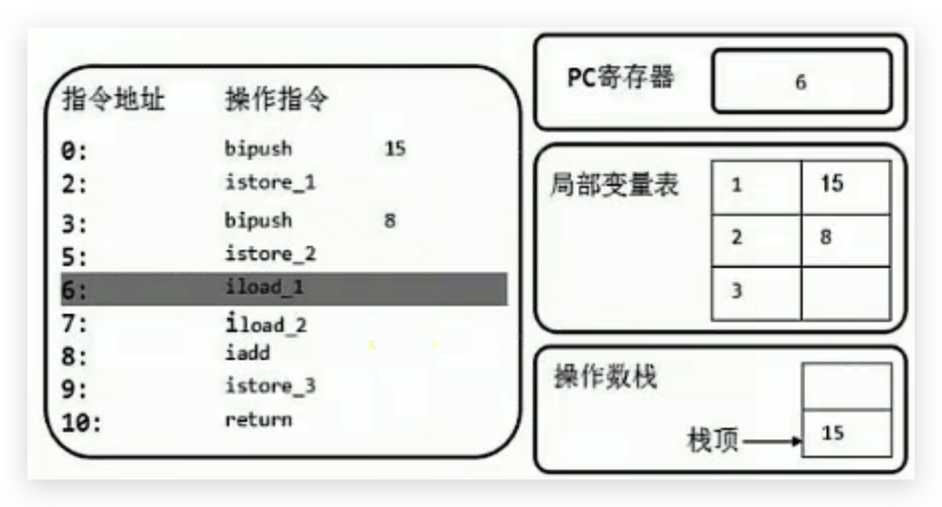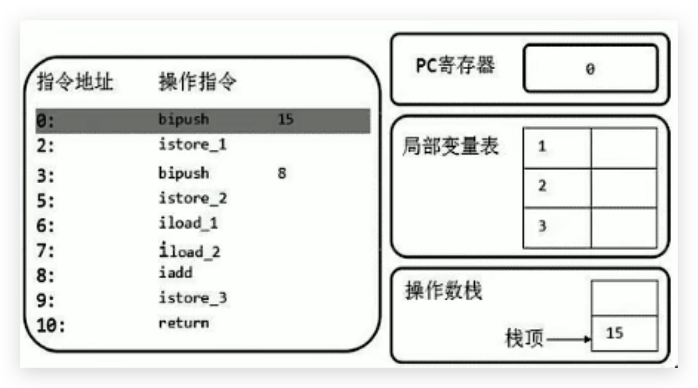 首先执行第一条语句,PC寄存器指向的是0,也就是指令地址为0,然后使用bipush让操作数15入操作数栈。
