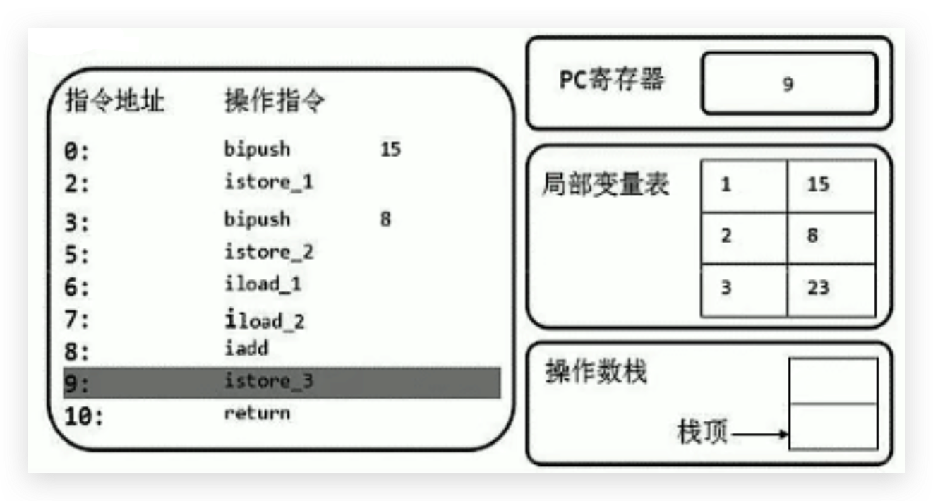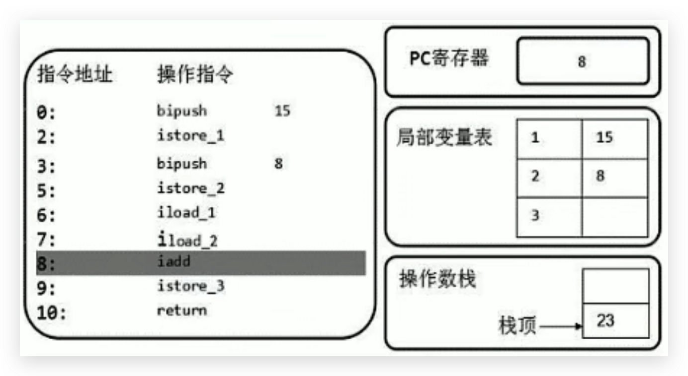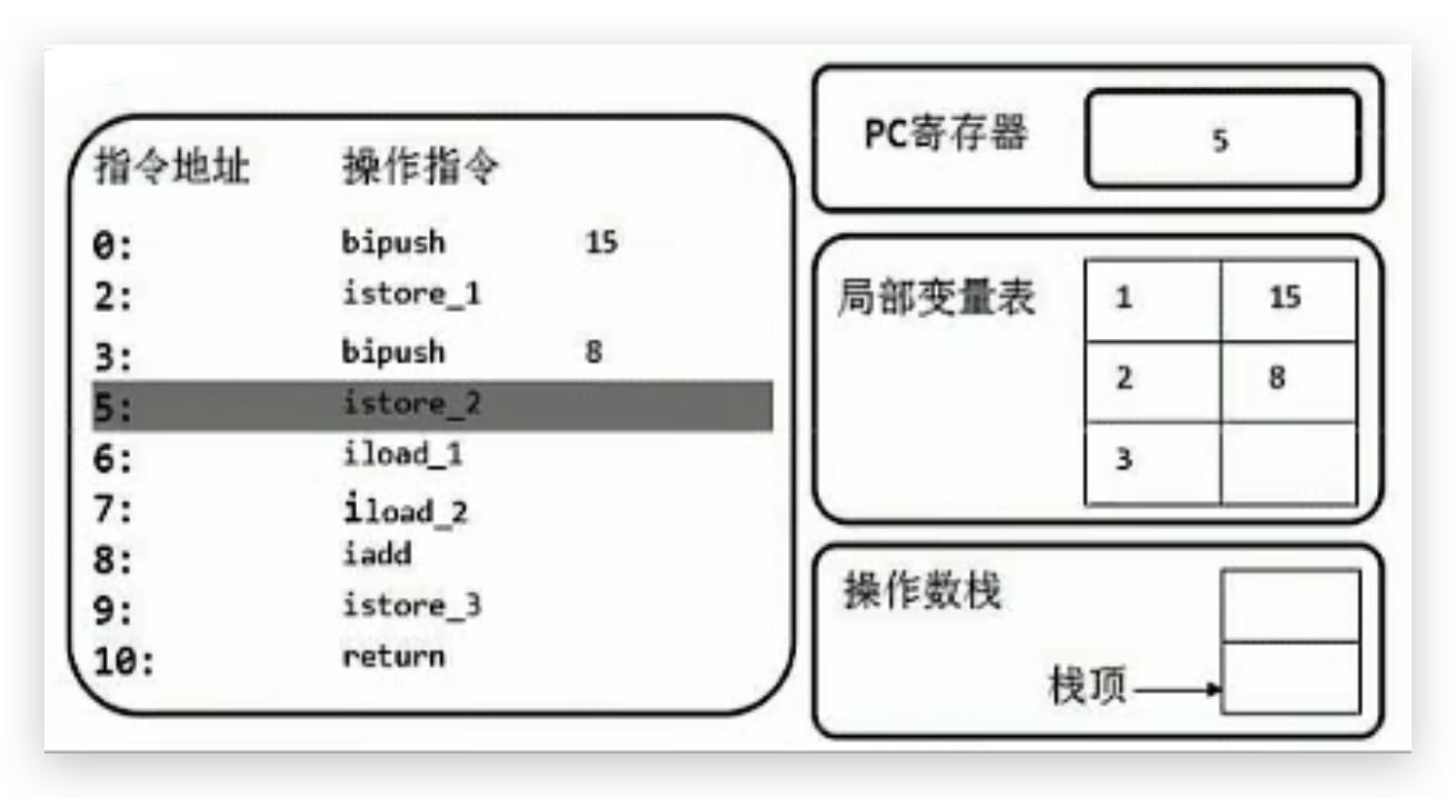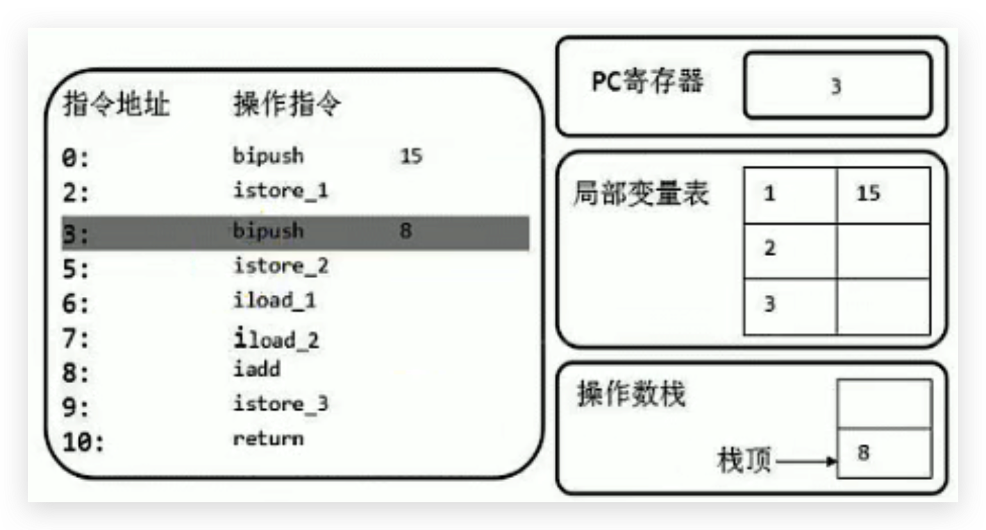 首先执行第一条语句,PC寄存器指向的是0,也就是指令地址为0,然后使用bipush让操作数15入操作数栈。