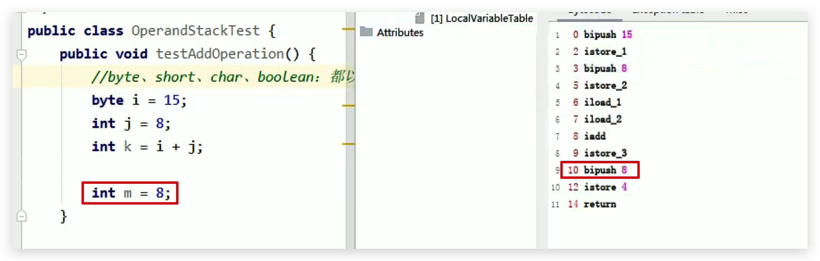 因为 8 可以存放在 byte 类型中,所以压入操作数栈的类型为 byte ,而不是 int ,所以执行的字节码指令为 bipush 8,但是存储在局部变量的时候,会转成 int 类型的变量:istore_4。