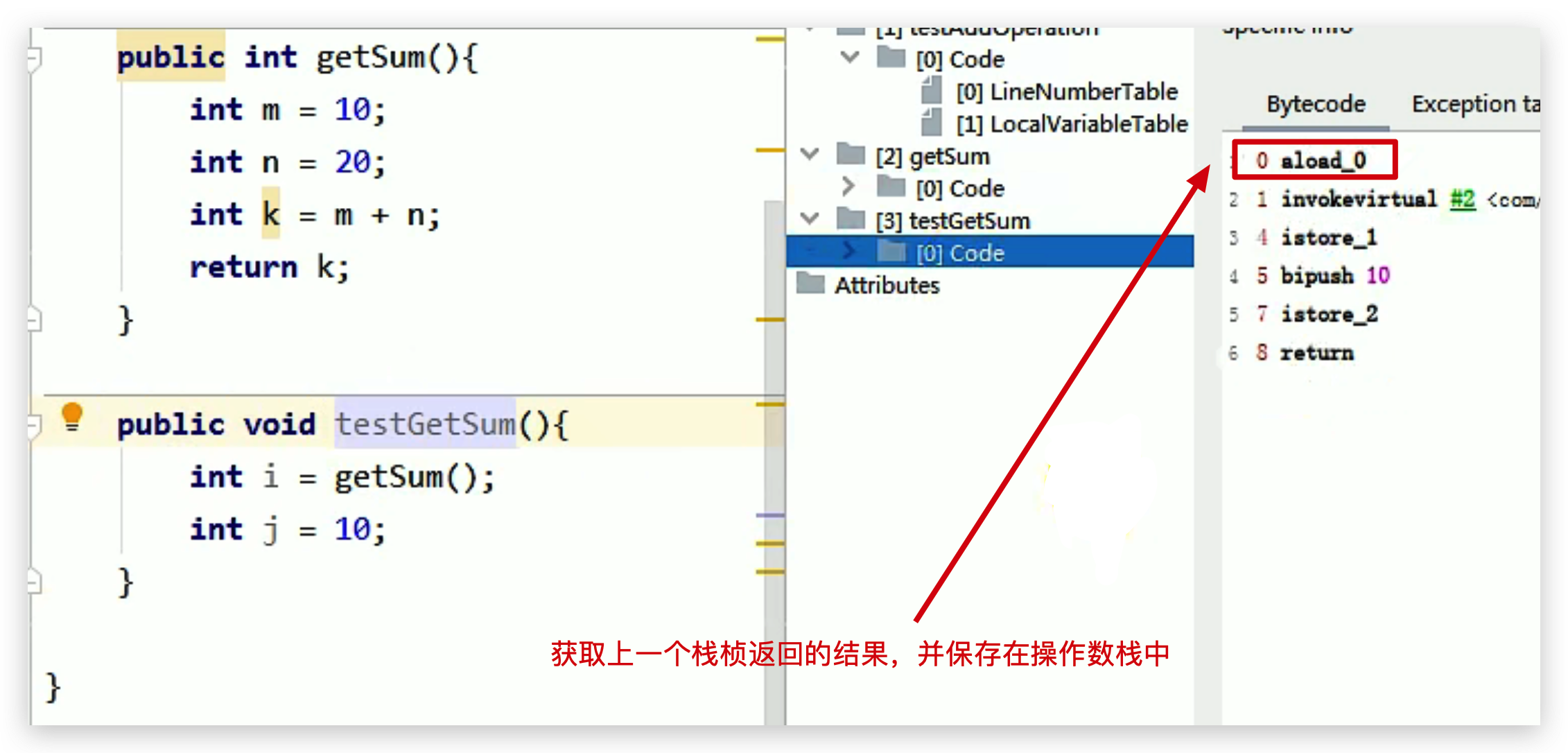 testGetSum() 方法字节码指令:一上来就加载 getSum() 方法的返回值()