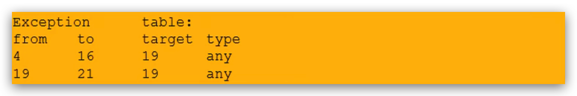 - 反编译字节码文件,可得到 Exception table