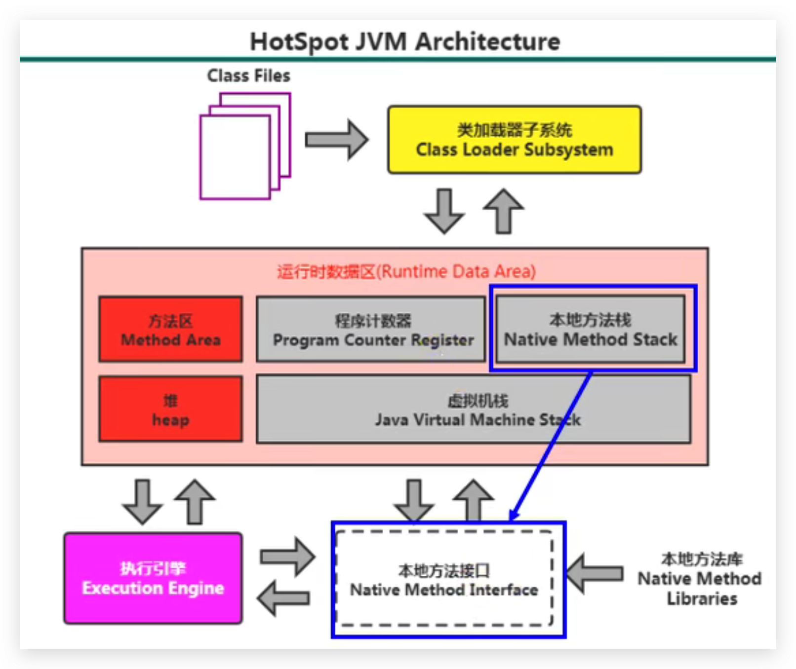 - 它的具体做法是Native Method Stack中登记native方法,在Execution Engine 执行时加载本地方法库。
