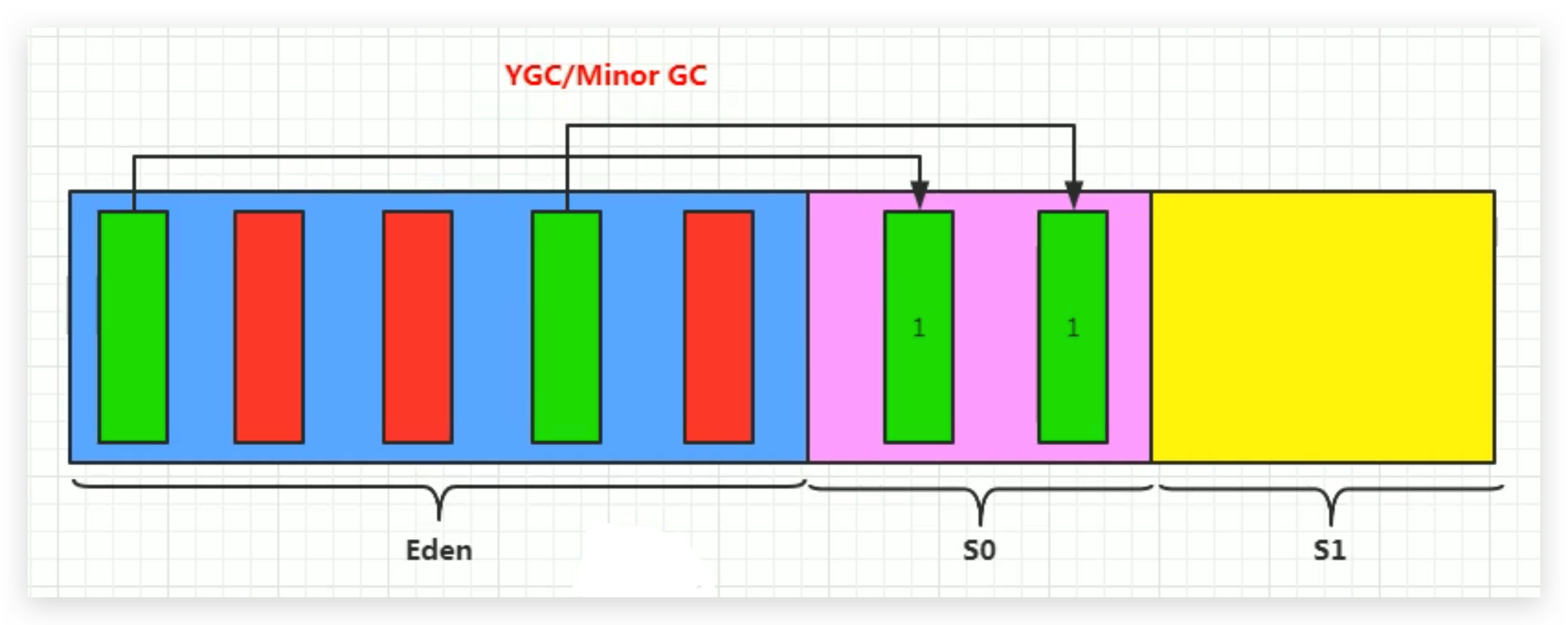 叫做 Minor GC 或者 YGC(Young GC),目的是将伊甸园区的不再被其他对象所引用的对象进行销毁;再加载新的对象放到伊甸园区。 - 然后将伊甸园中的剩余对象移动到幸存者0区(或者叫做 to 区),此时把对象的年龄标记为1