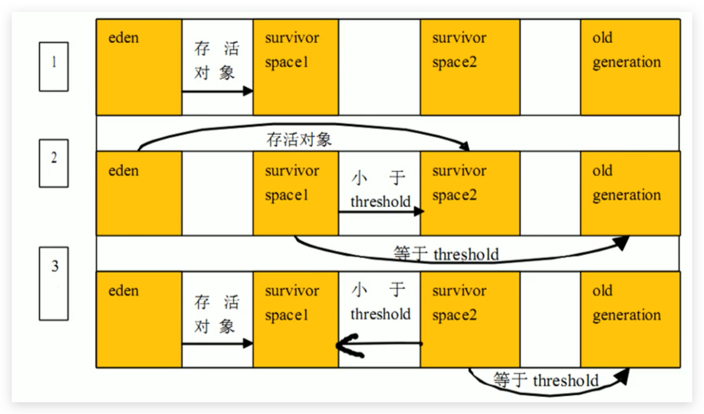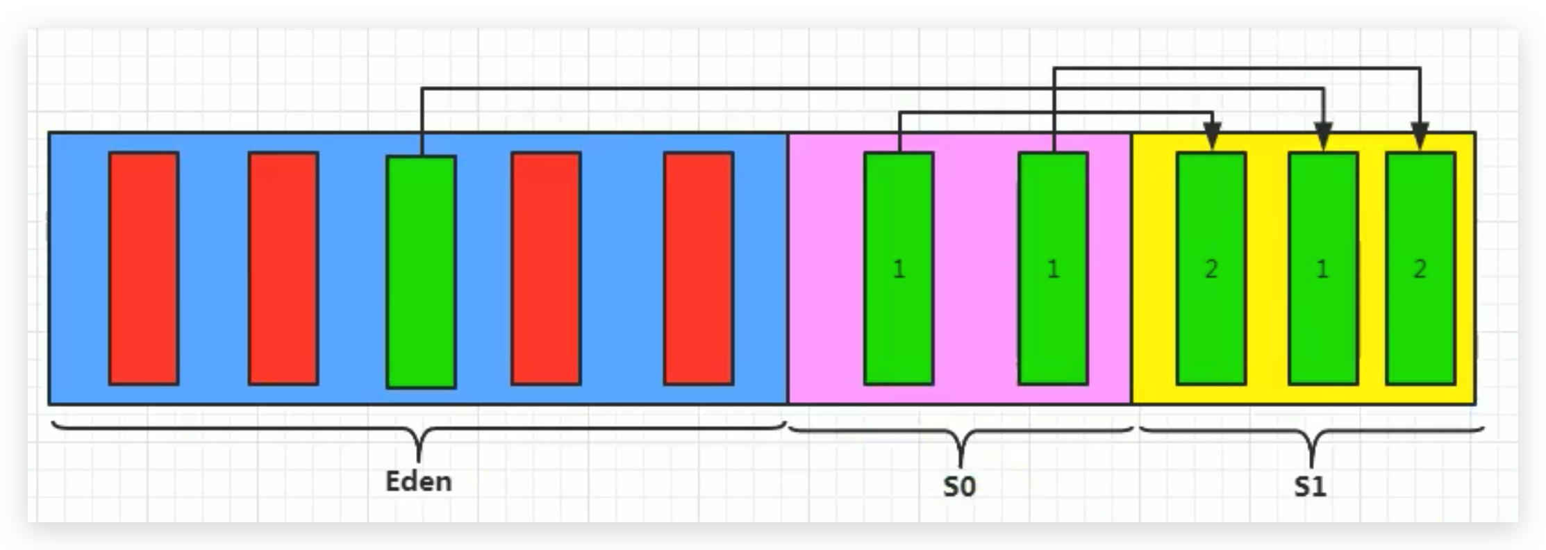 - 如果下一次伊甸园区又满了,再次触发垃圾回收YGC,此时除了将伊甸园中的剩余对象移动到幸存者1区外(这些对象的年龄记为1),还有上次幸存下来的放到幸存者0区的,如果没有被回收,也会被放到幸存者1区(这些对象的年龄记为2)。