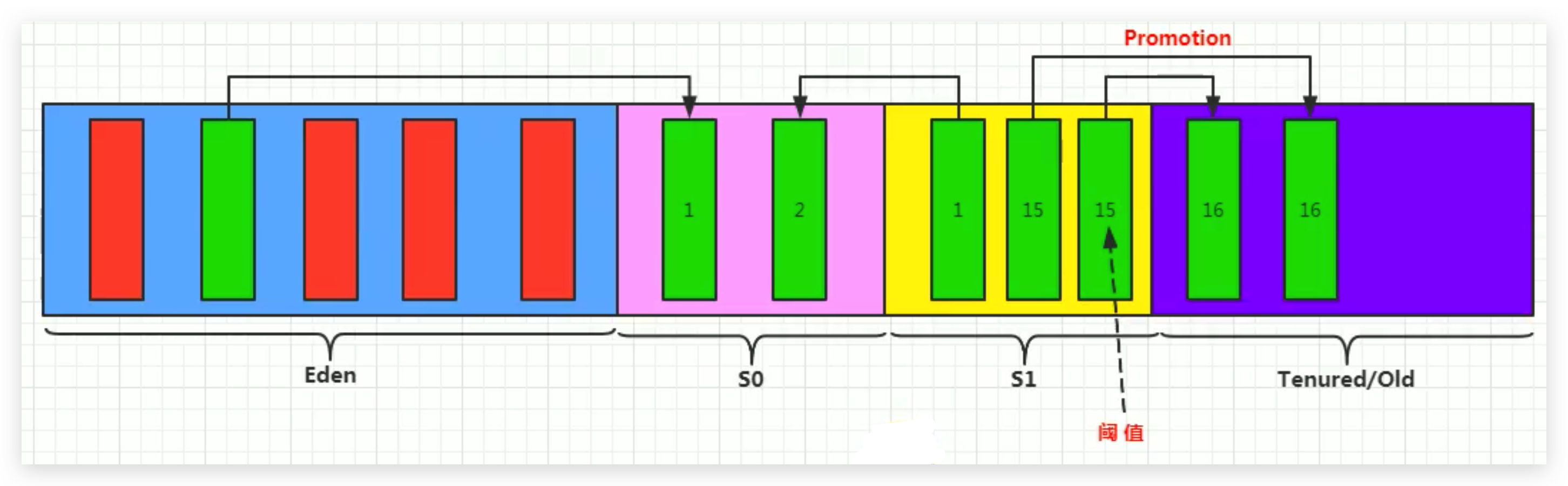 当幸存者区的对象的年龄超过15,或者说反复移动15次以上,JVM 就会把这些对象晋升(Promotion)到老年代。