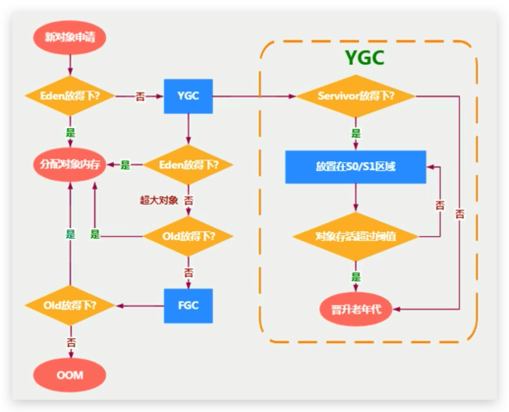 - 如果 Eden 执行了 Minor GC(YGC) 还是无法放不下该对象,说明是超大对象,直接放到老年代