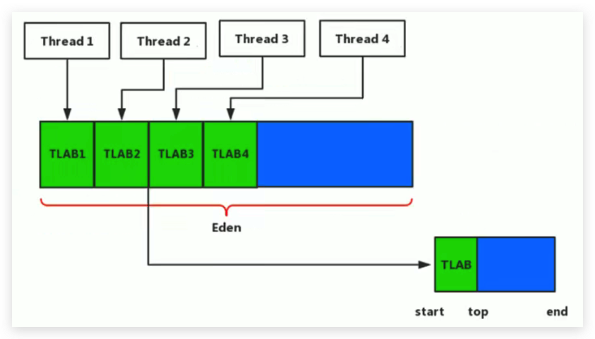 TLAB:Thread Local Allocation Buffer- 从内存模型而不是垃圾收集的角度,对Eden区域继续进行划分,JVM为每个线程分配了一个私有缓存区域,它包含在Eden空间内。