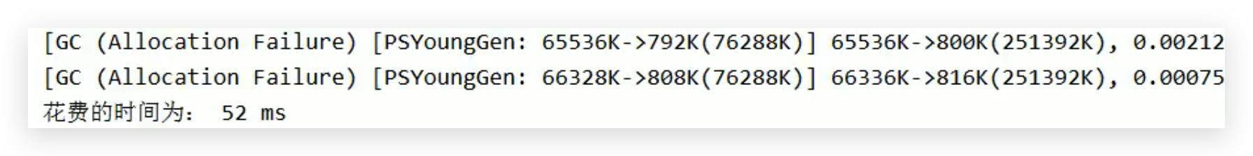-Xmx256m -Xms256m -XX:-DoEscapeAnalysis -XX:+PrintGCDetails执行结果:发生了GC,并且时间为 52ms